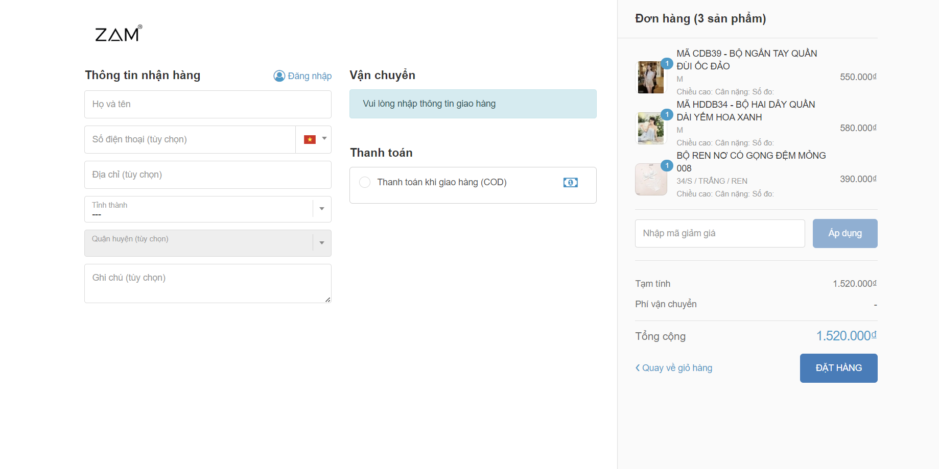 Sau khi nhận được đơn hàng từ quý khách, ZAM sẽ liên hệ bằng cách gọi điện lại để xác nhận lại đơn hàng và địa chỉ của quý khách.