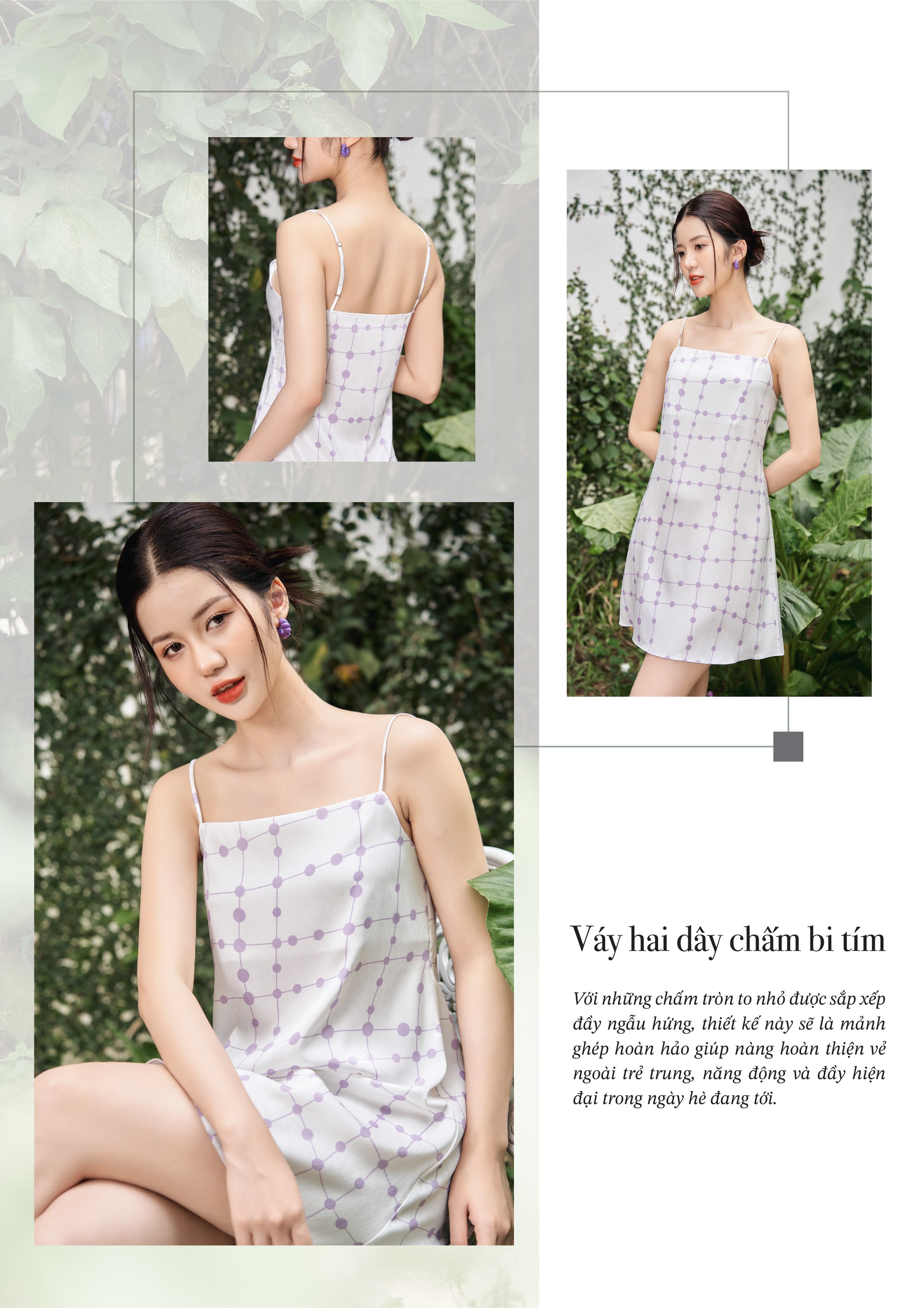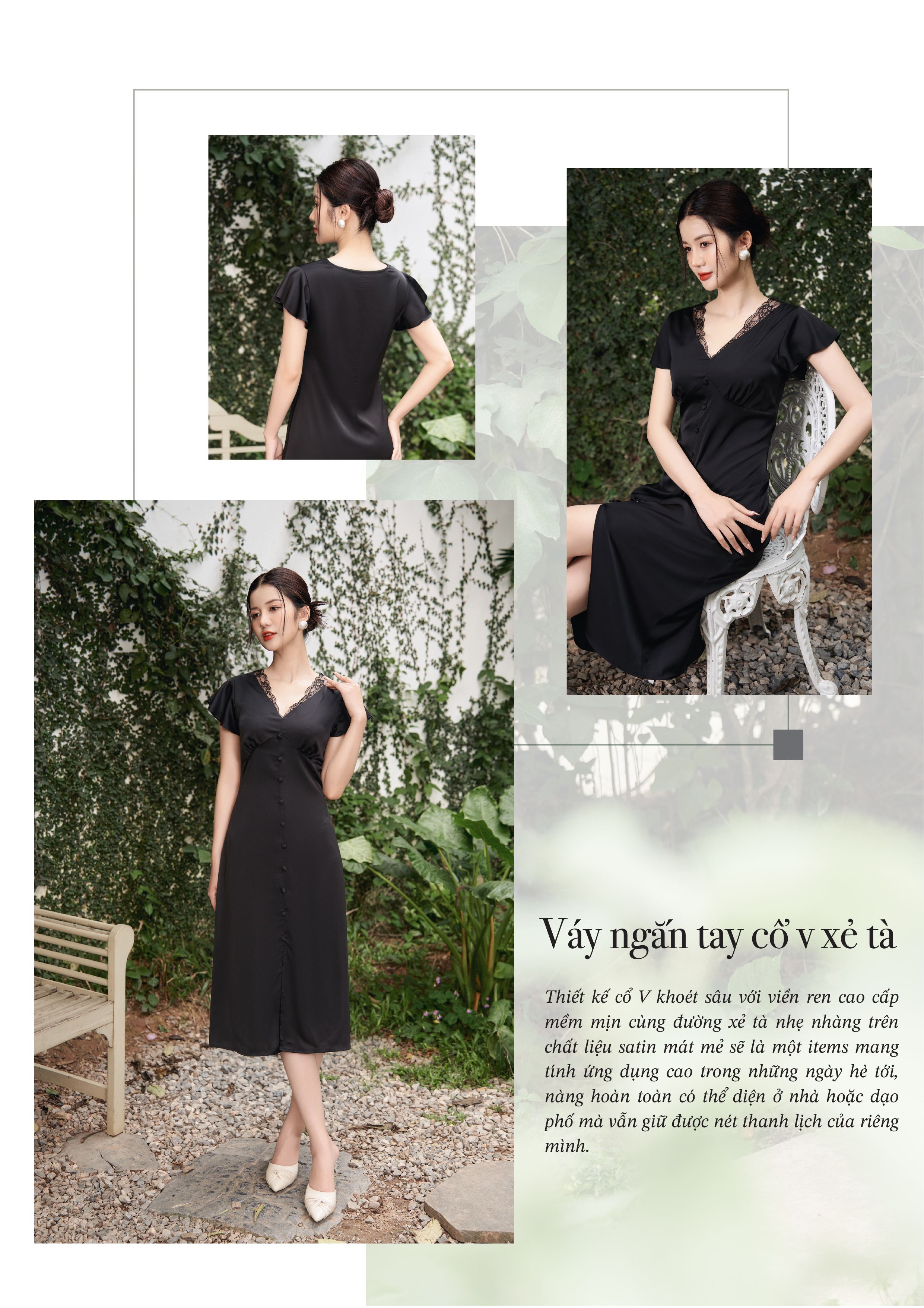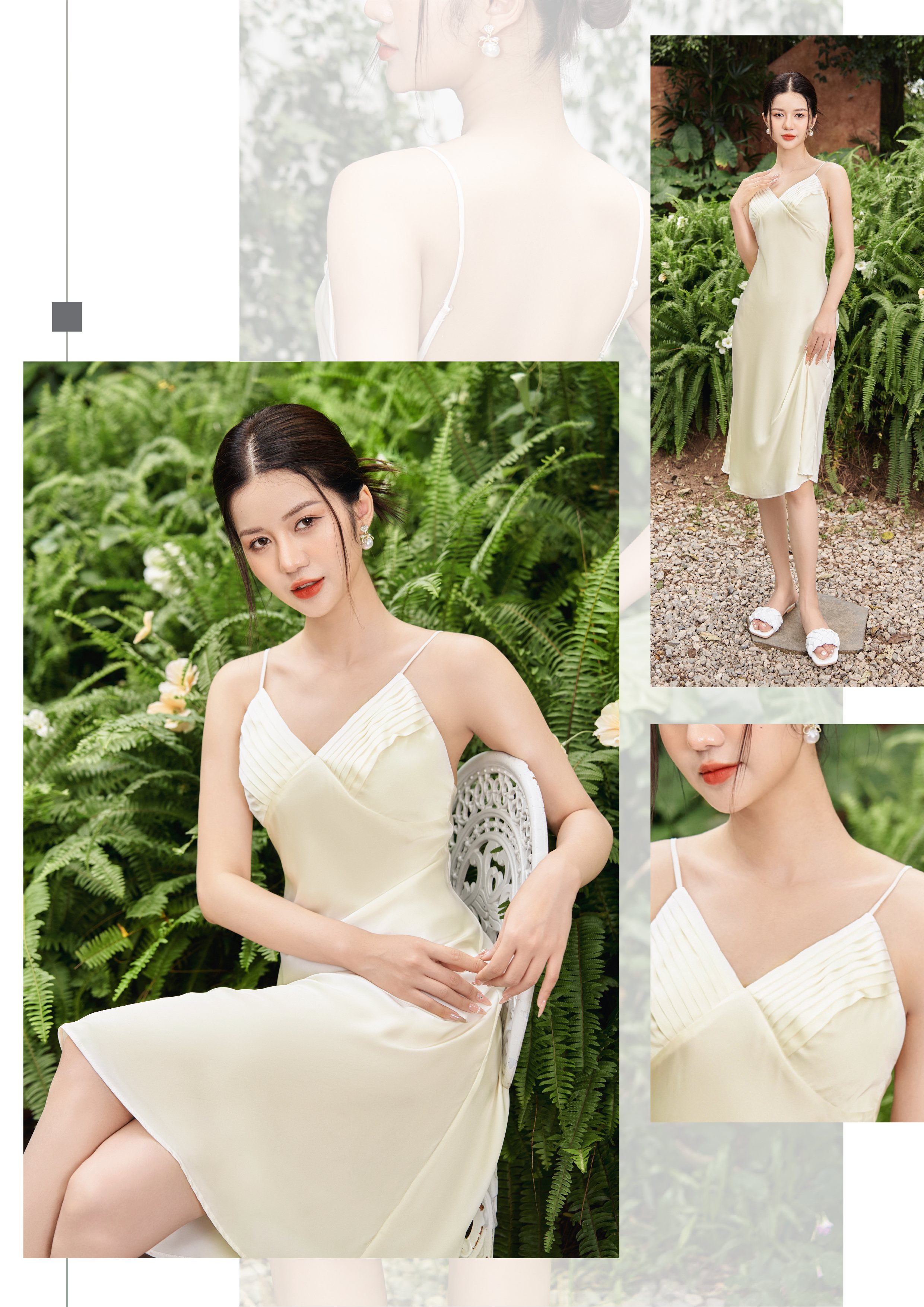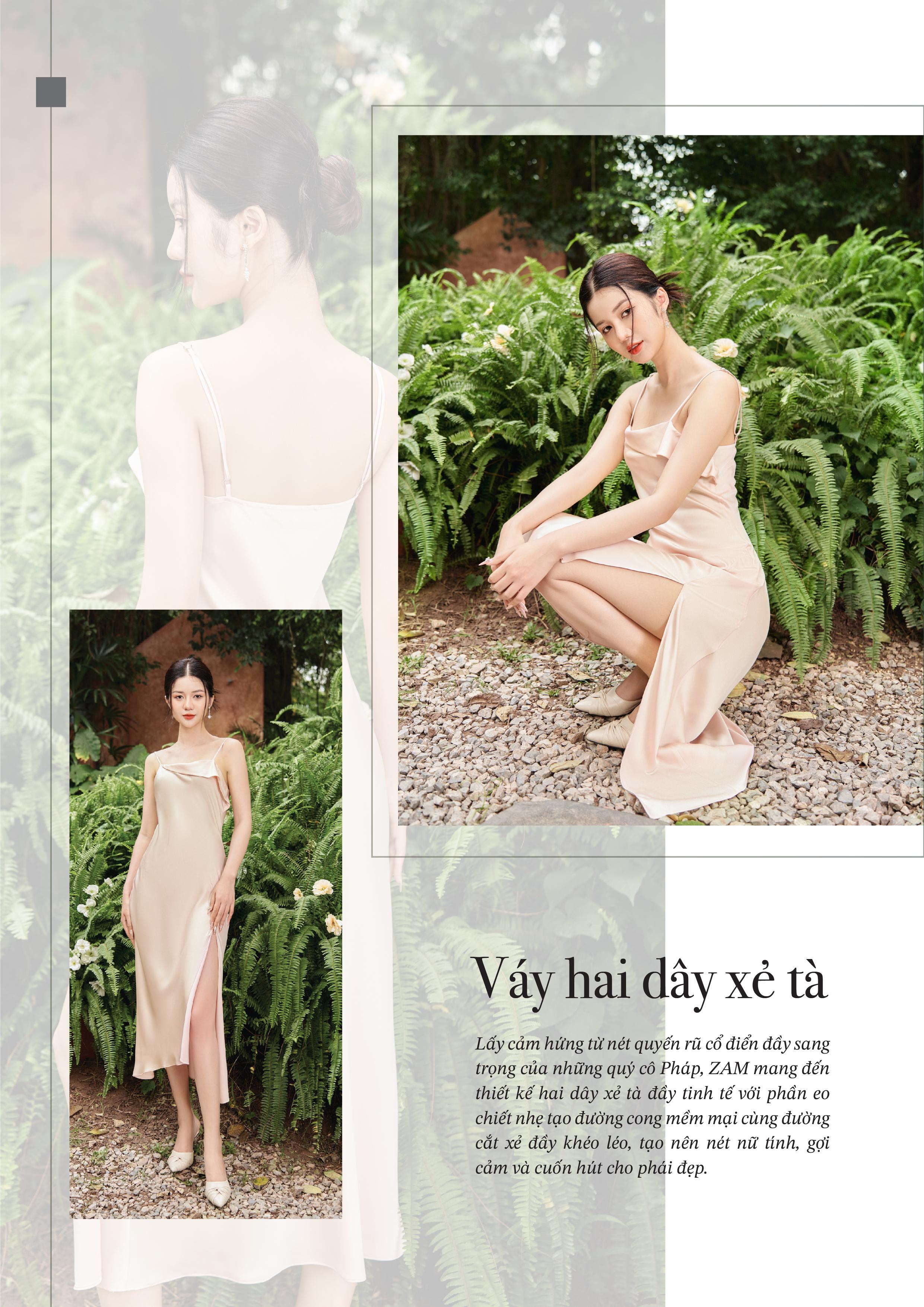 Xuyên suốt BST là những thiết kế váy thanh lịch mang tính ứng dụng cao với đường cắt xẻ tinh tế, tạo nên những form dáng thướt tha, bay bổng, mang đậm phong cách nữ tính, quý phái, cùng bảng màu thiên nhiên nhẹ nhàng như kem, xanh than, cam, tím, trắng ... góp phần vẽ nên bức tranh thời trang đậm chất thơ và đầy cuốn hút.